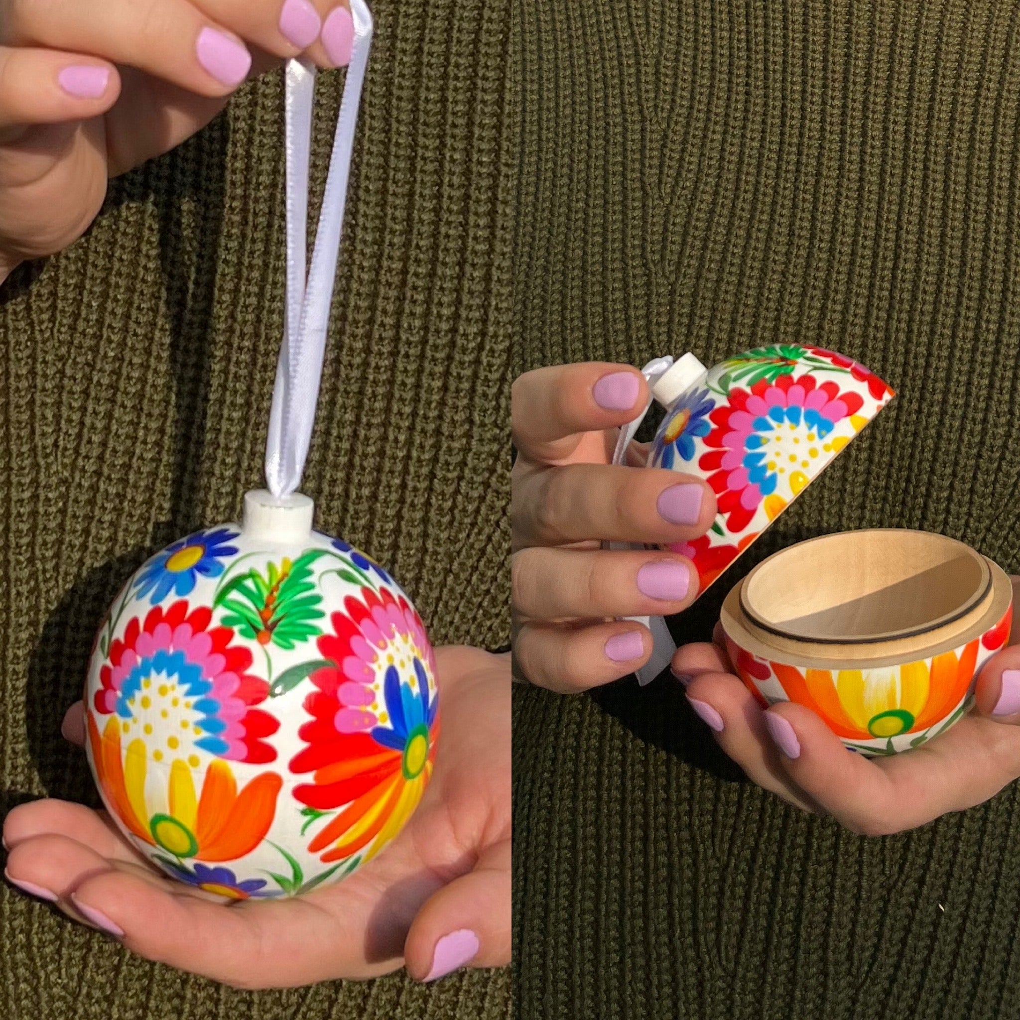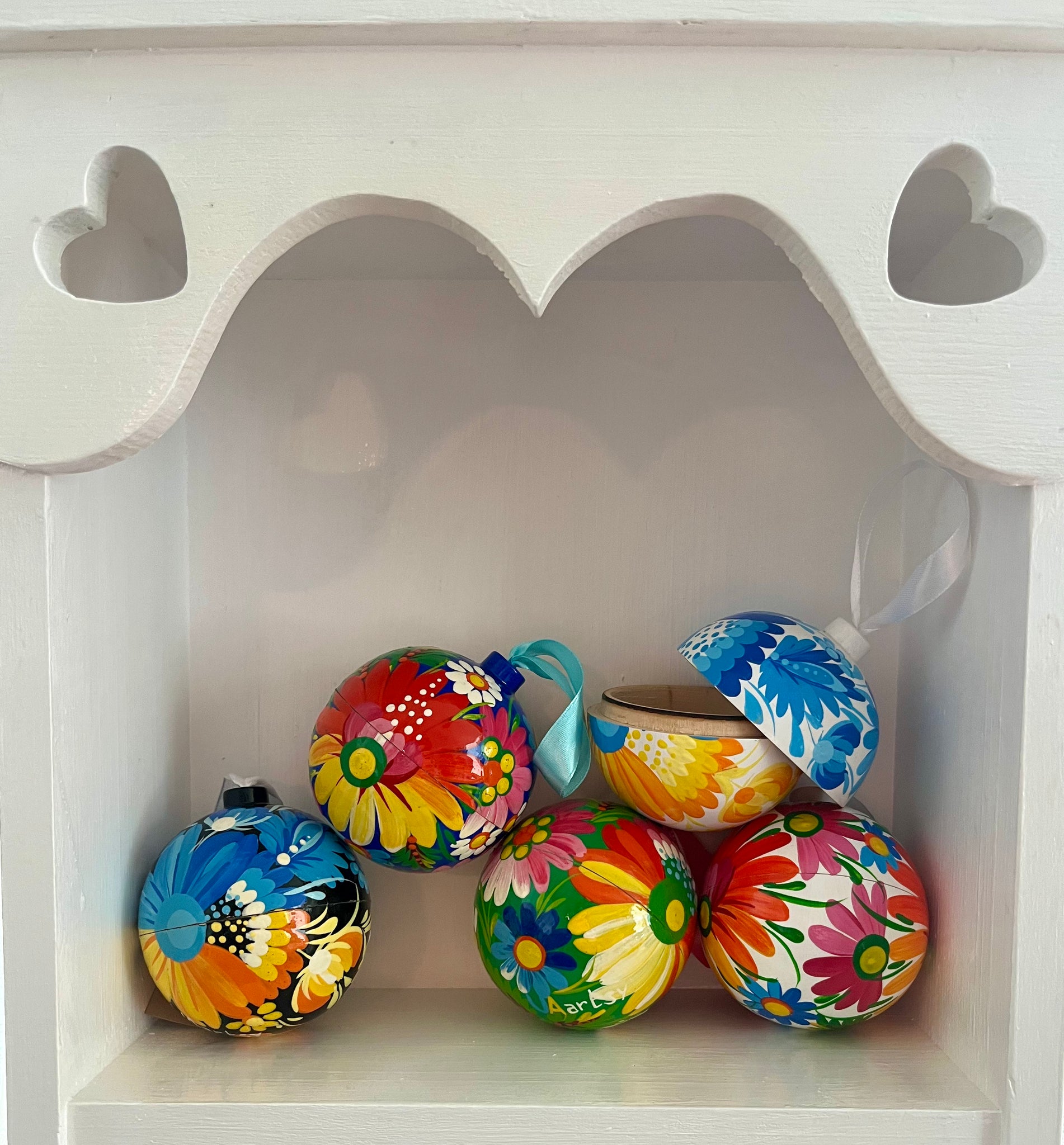 Hand painted ornaments Materials: acrylic on wood Size of ornament about 8cm