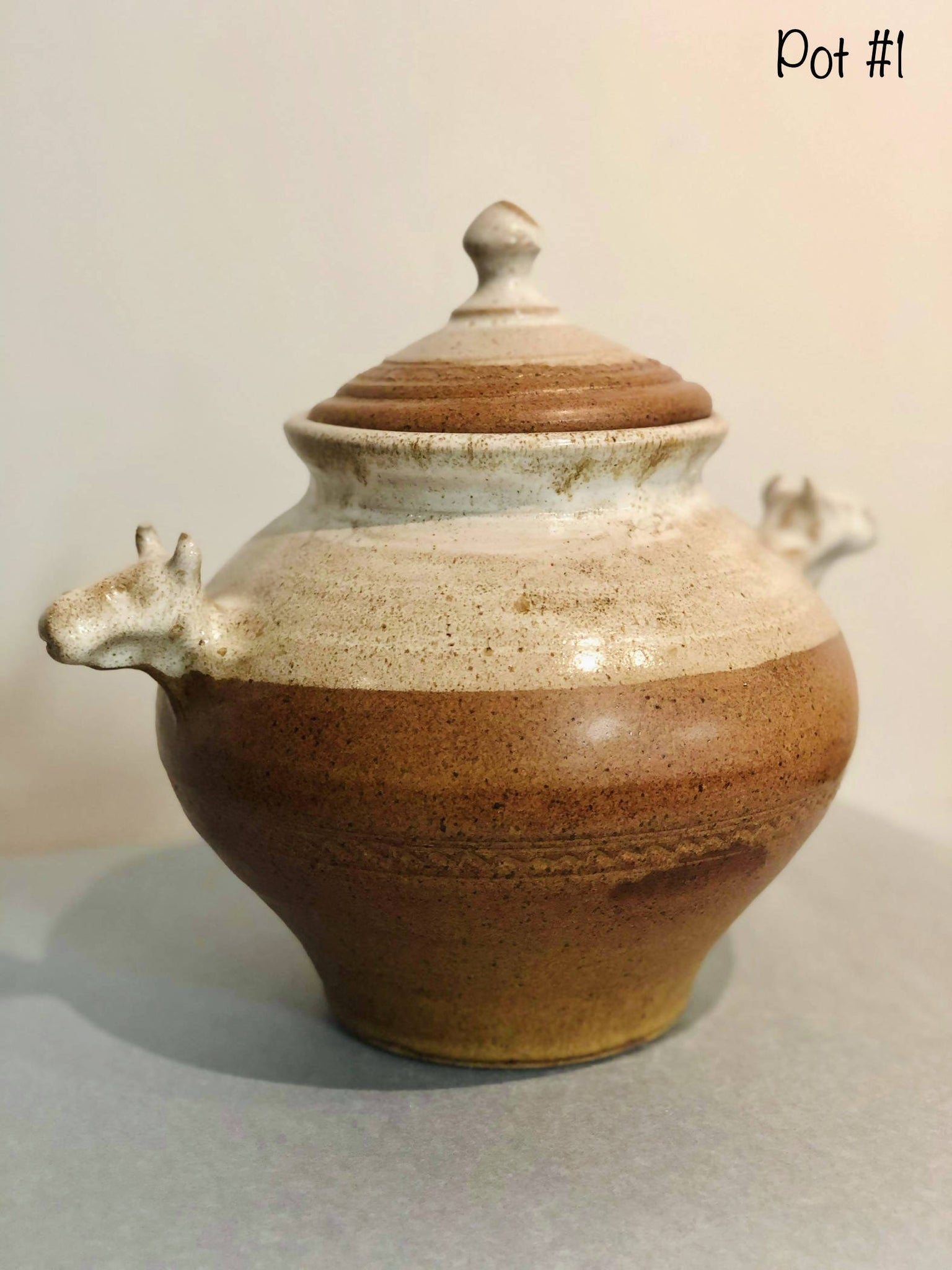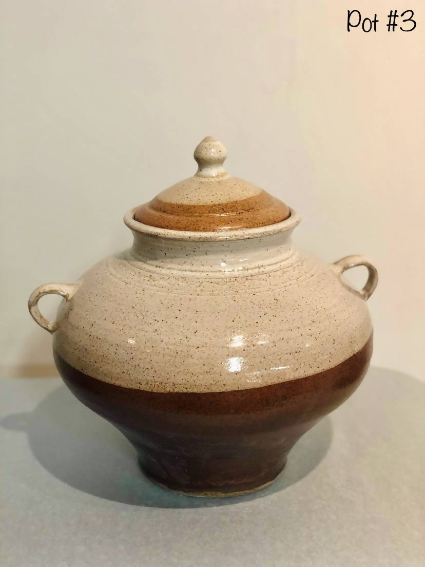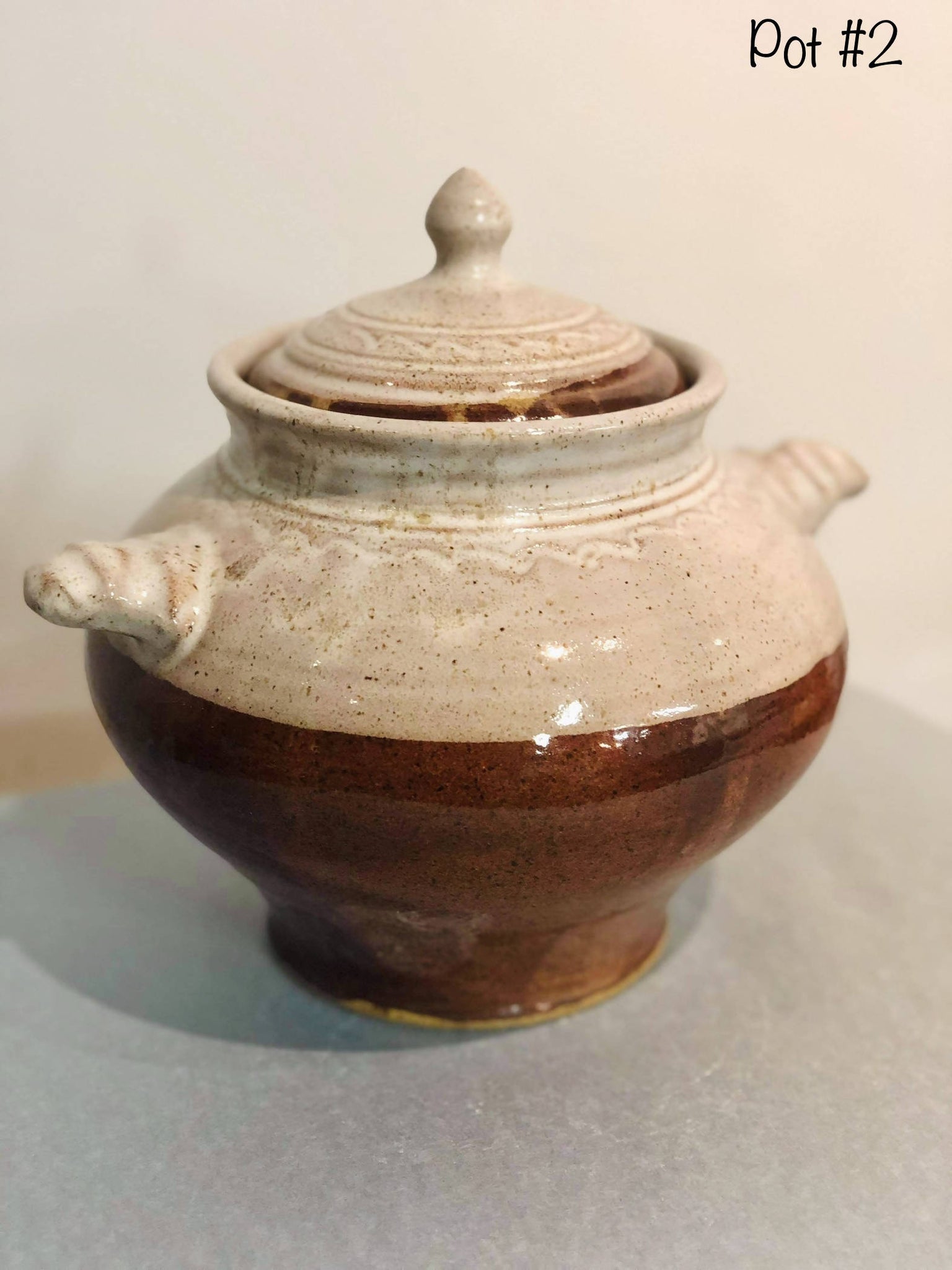 Each pot is handmade and wheel-thrown using a brown stoneware clay. After a handle is attached to the pot, the entire piece is placed into the kiln to undergo its first firing. The pot is then glazed and enters the kiln for its second firing. After it comes out of the final firing, it's ready to find a new home with you!