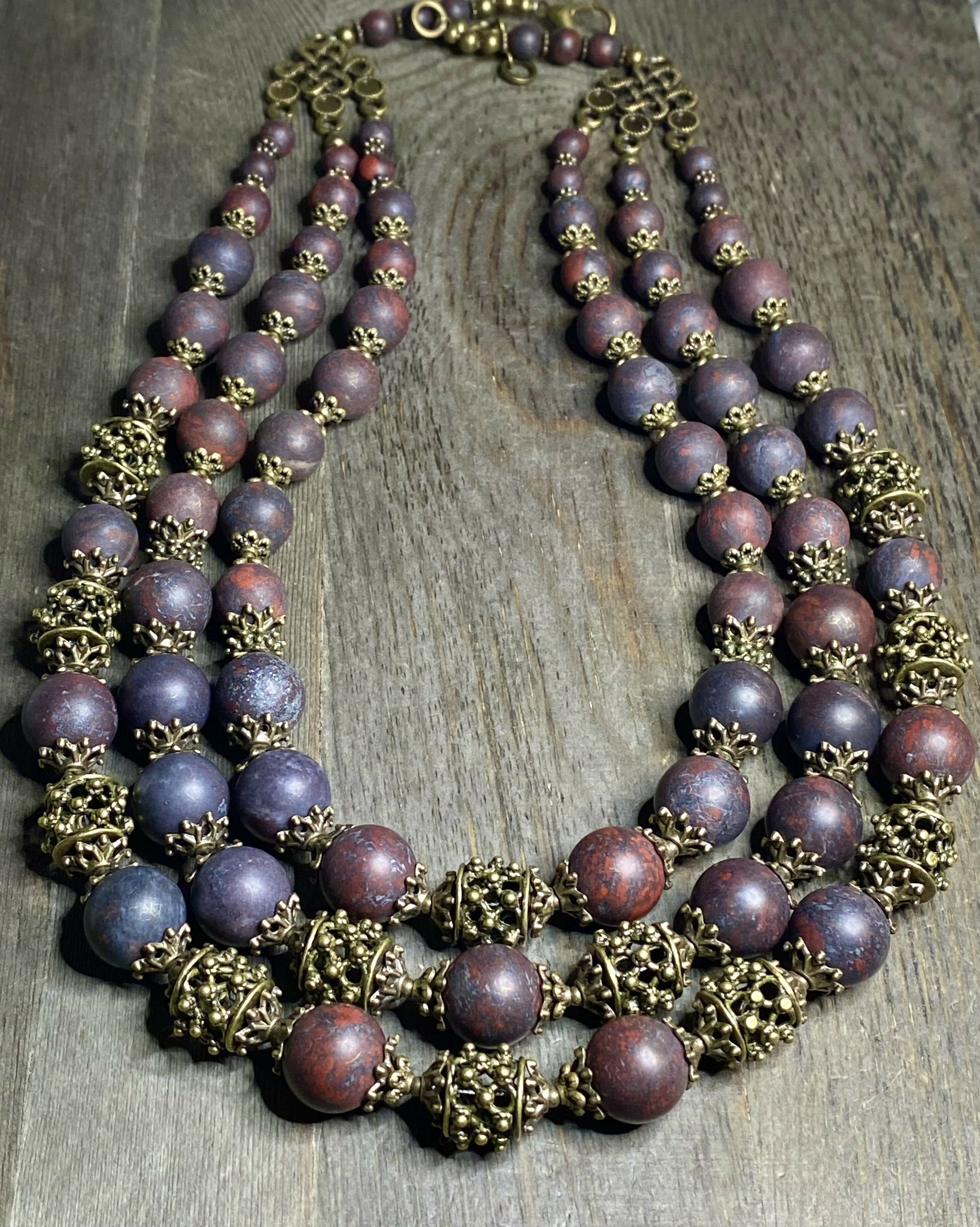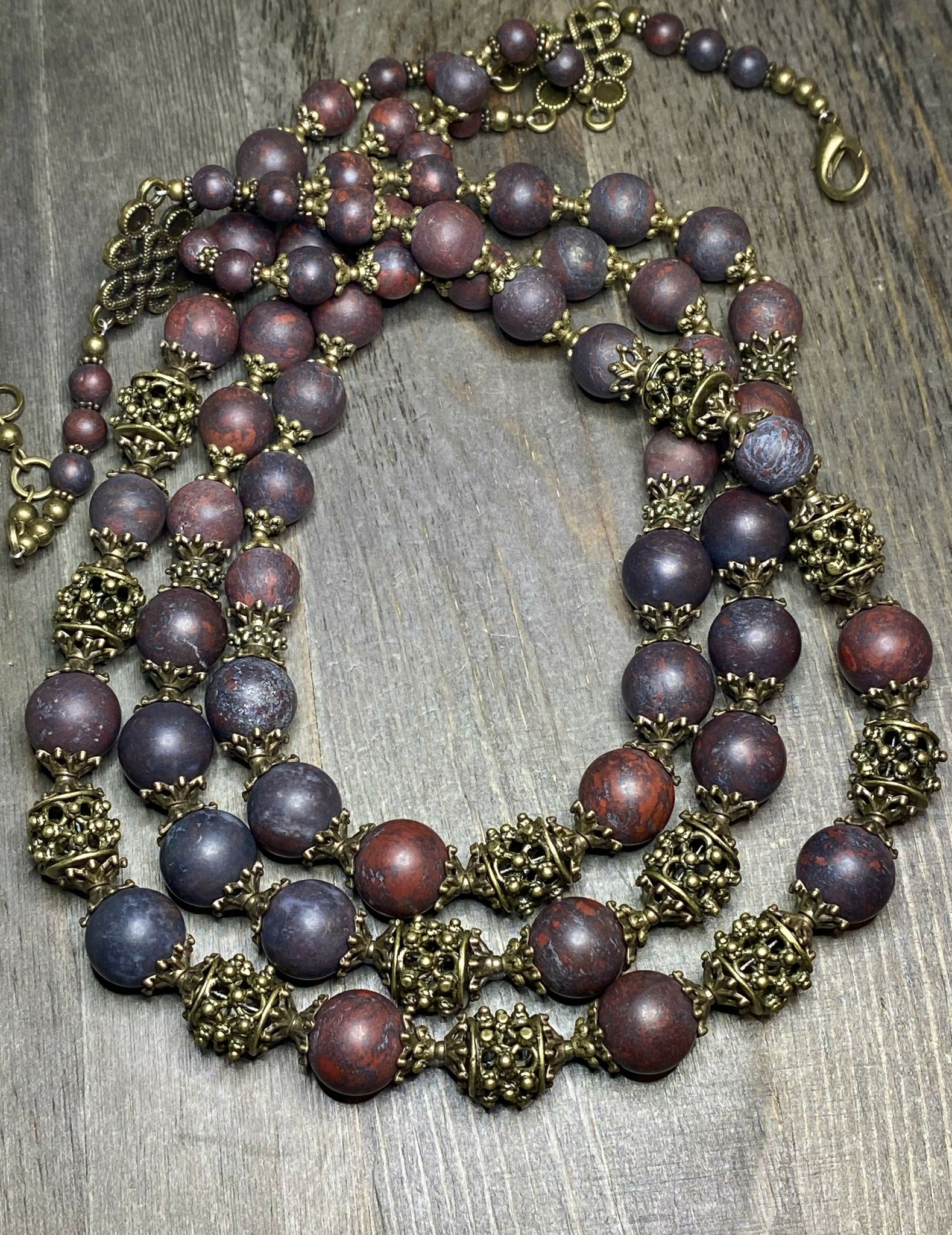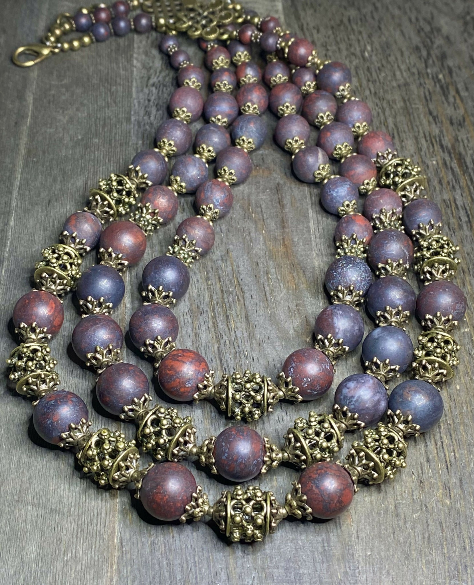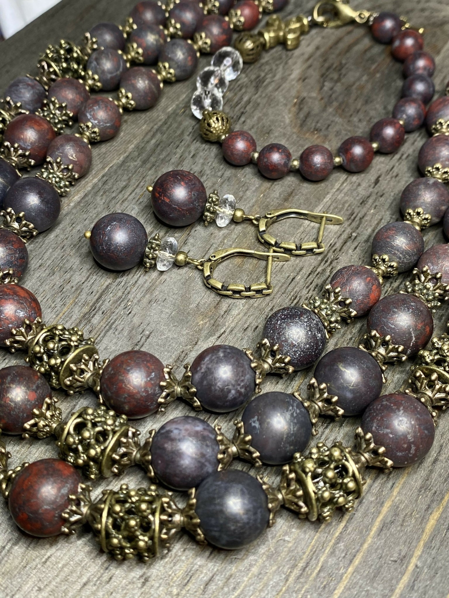 Set "Bloody Land" - Brass Beads 12x12mm, Matte Dark Red Flower Jasper Beads (bigger 12mm), Clear Crystal Quartz Faceted Beads, Brass Accessories, Three Strands.