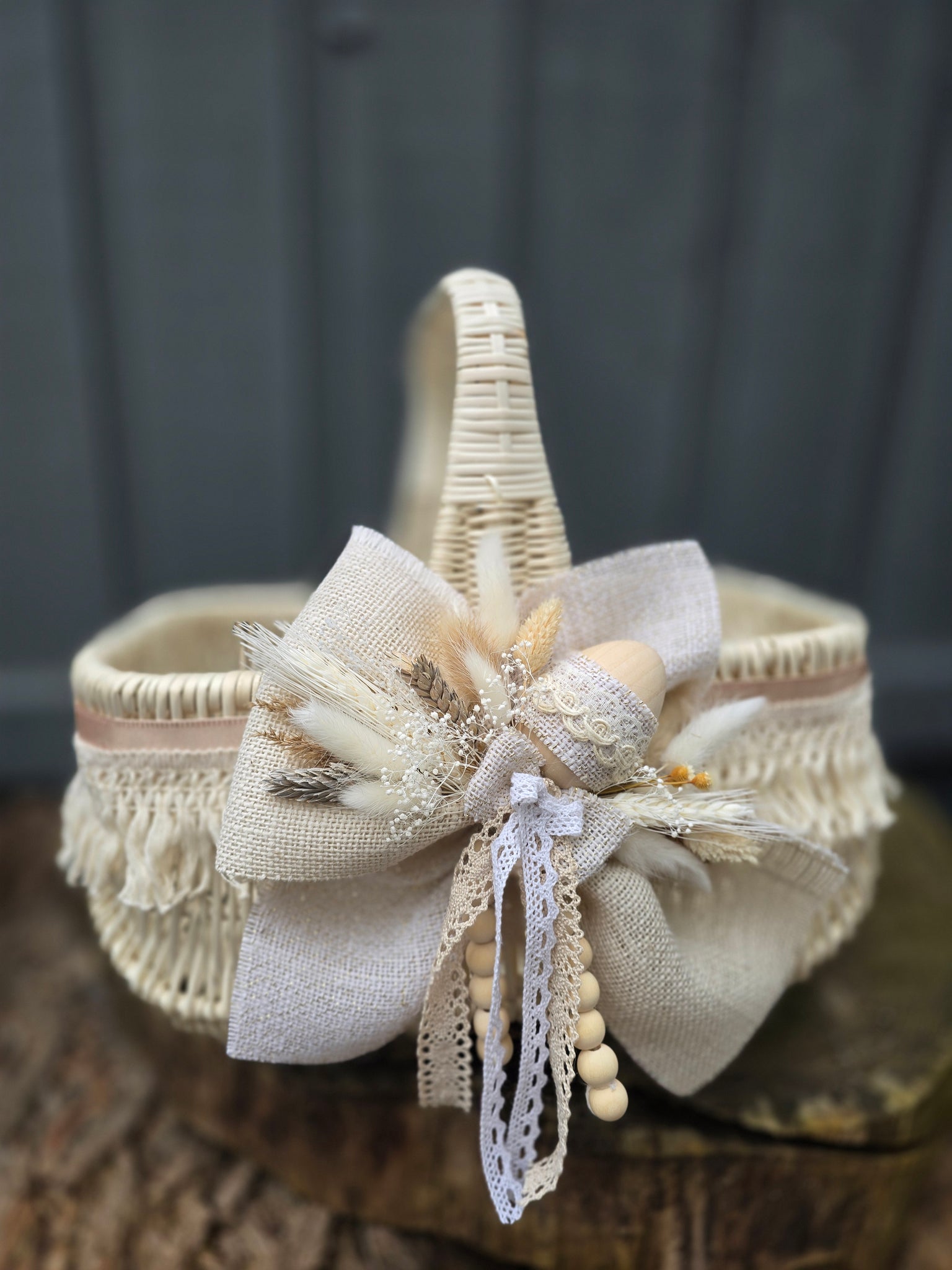 Designer Etno Style Easter Basket “Early morning with wooden egg“ wood, dry flowers and organic fabric / adult size large 36x27cm