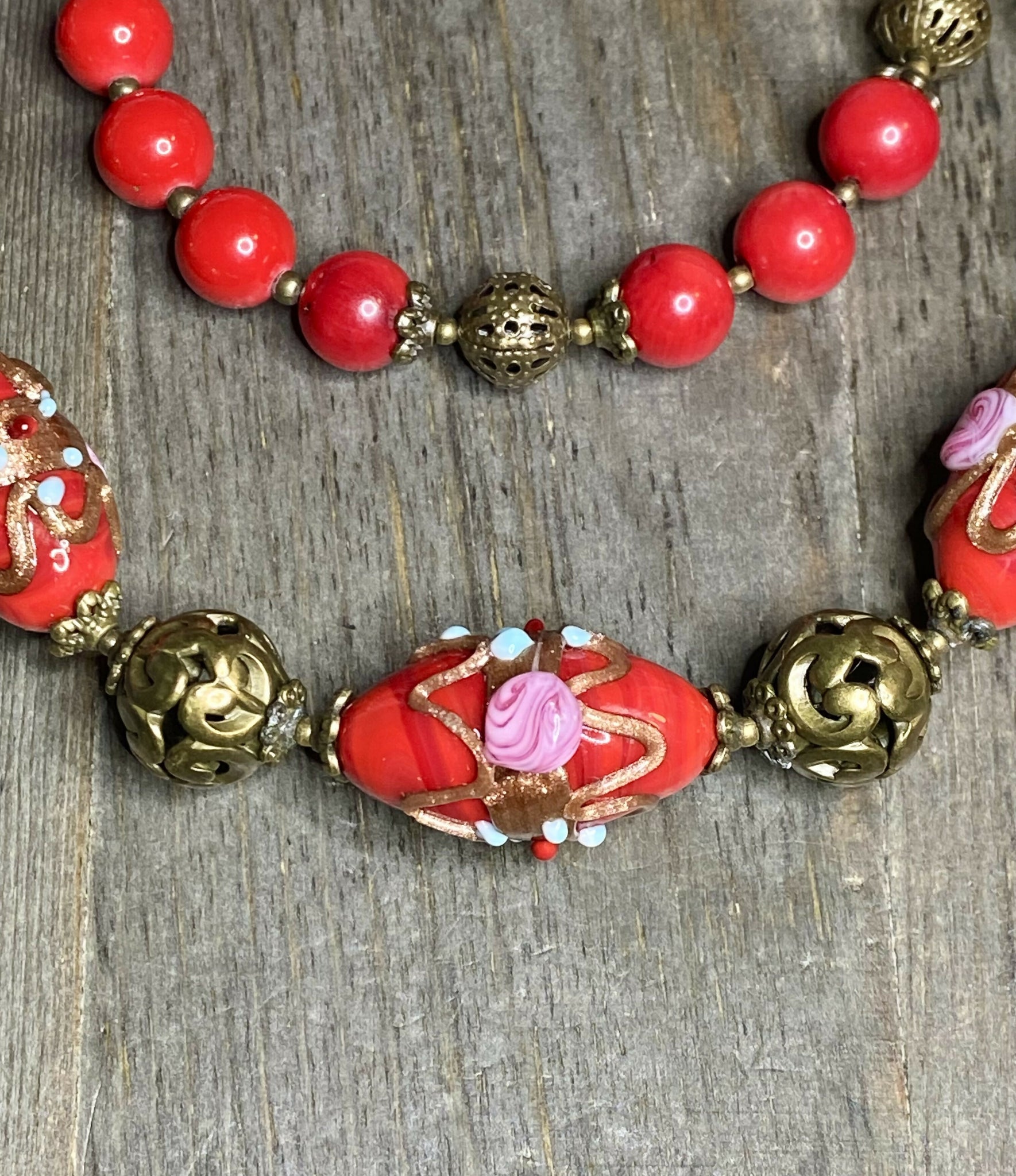 Set "Sun Rose on Early Sunday" - Handmade Venetian Murano Glass Beads 24x17mm, Brass Filigree Beads, Bamboo Coral Beads.