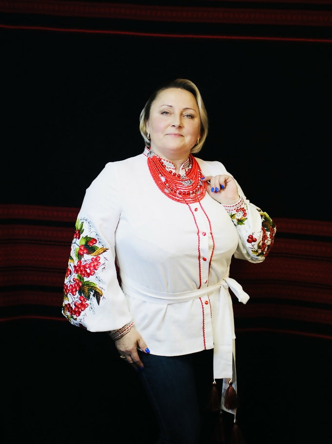 Ukrainian Embroidered Blouse “Kalyna” – Elegant vyshyvanka with vibrant floral sleeves and red details. Perfect for cultural events or everyday elegance.