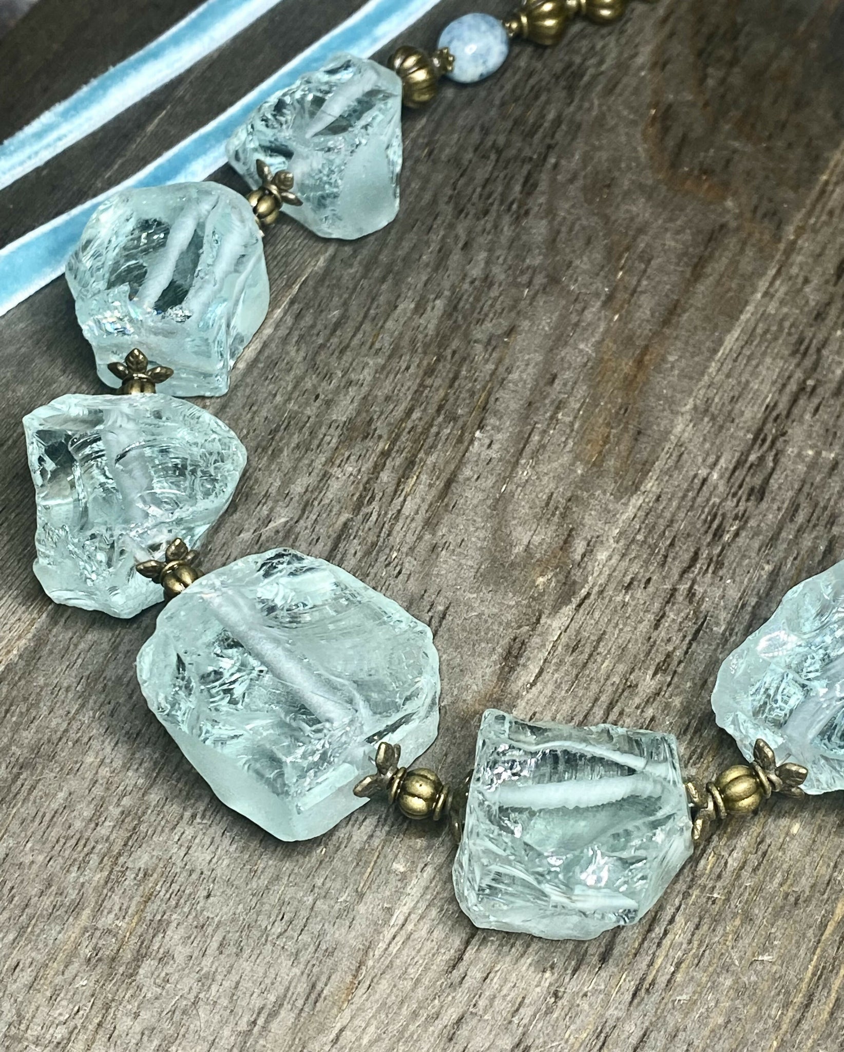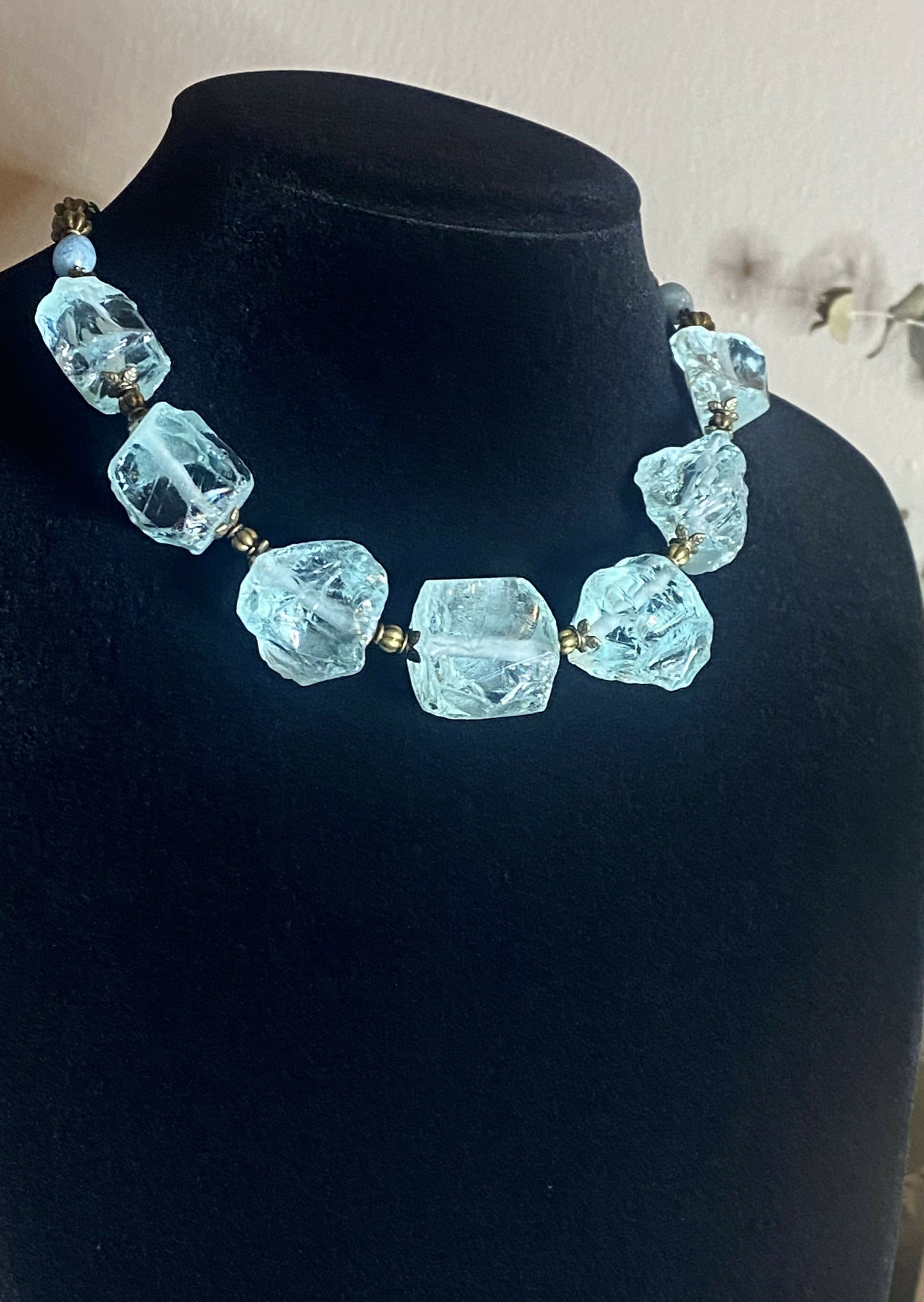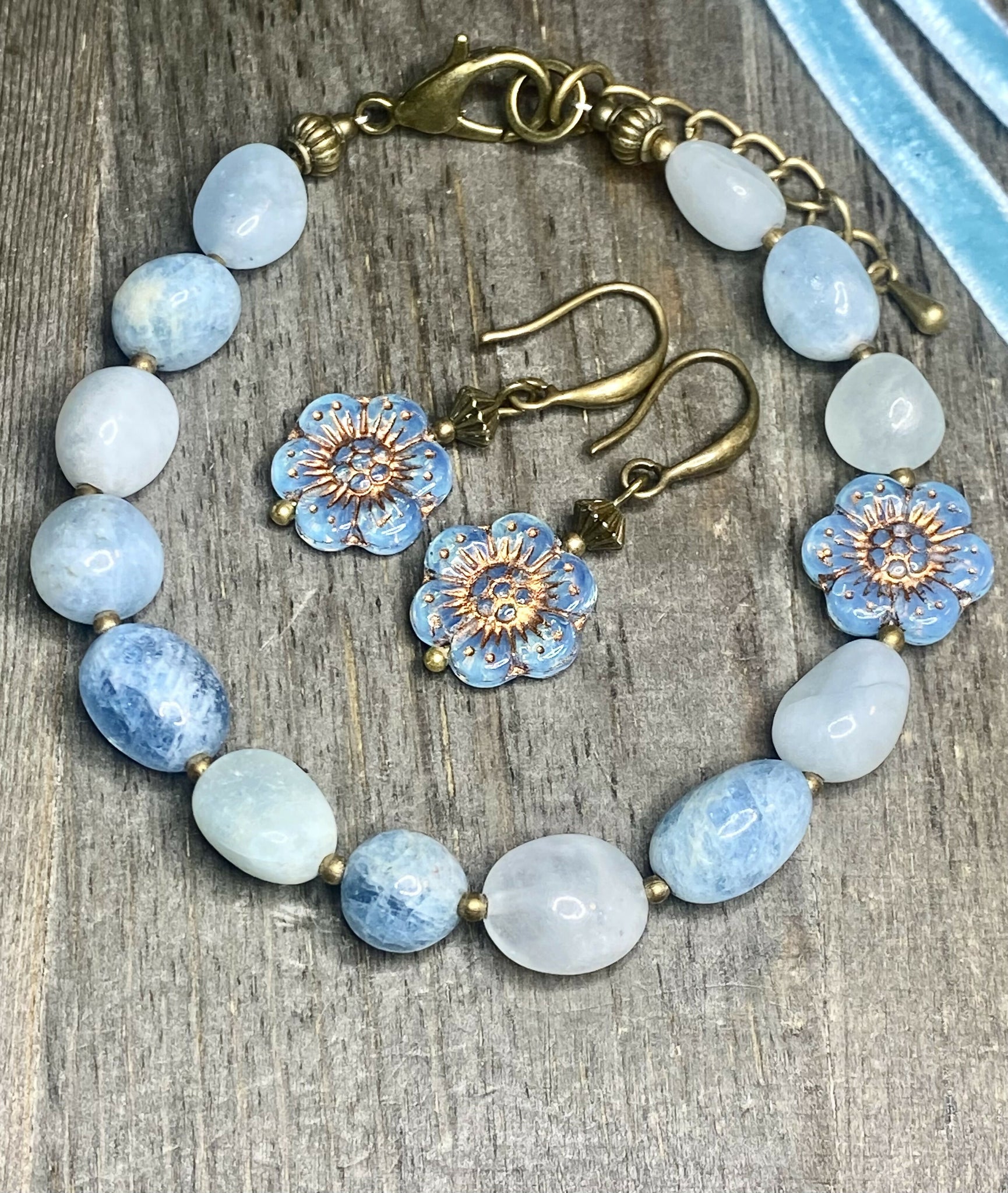 Set "Winter Wellspring" - Gorgeous Nugget Blue Quartz Beads 2.5-2mm, Nugget Aquamarine Beads 12-8mm, Czech Glass Flower Beads 14mm, Velvet Ribbon, Brass Beads.