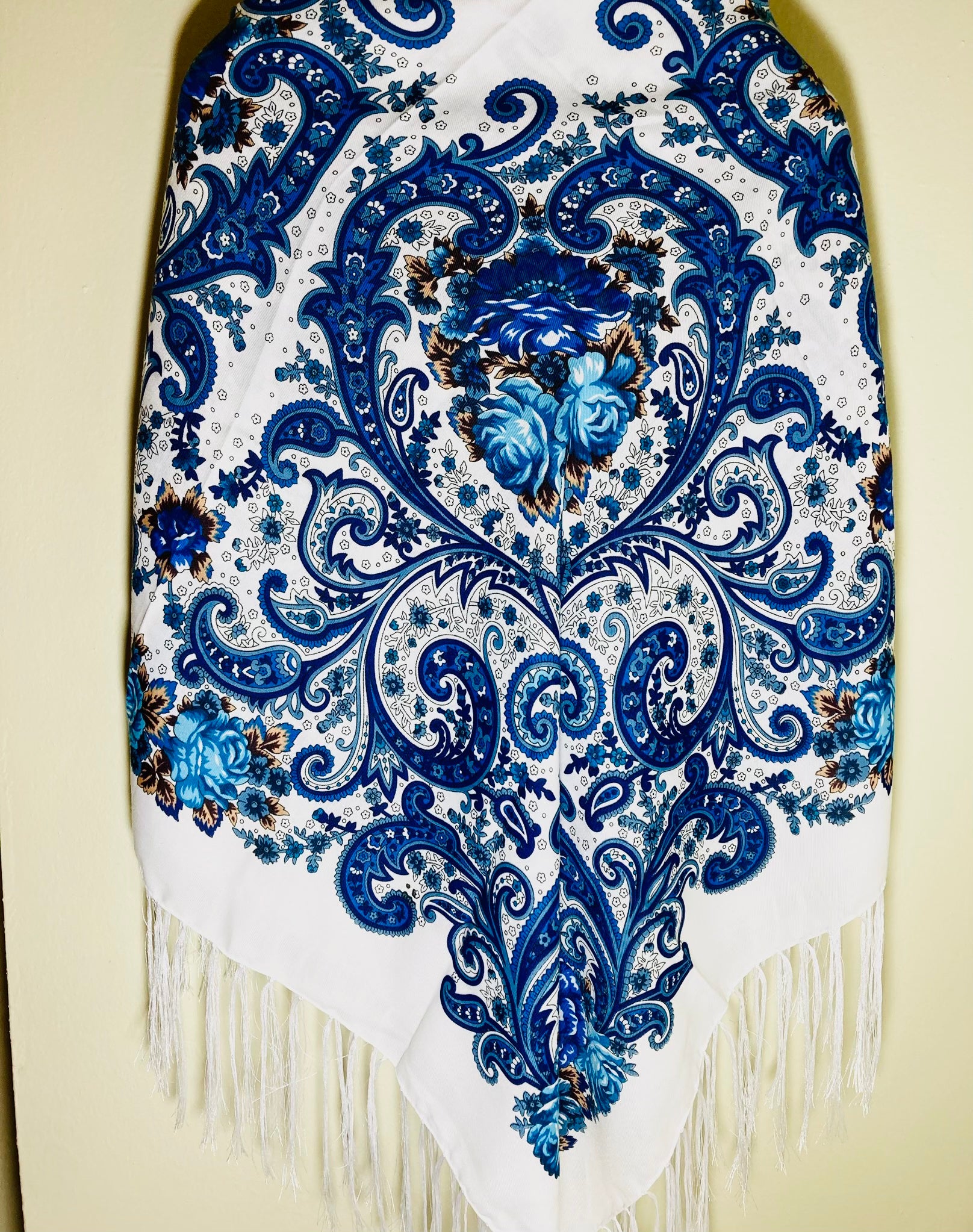 Woolen shawl / scarf with flowers “Dream”/ white with blue